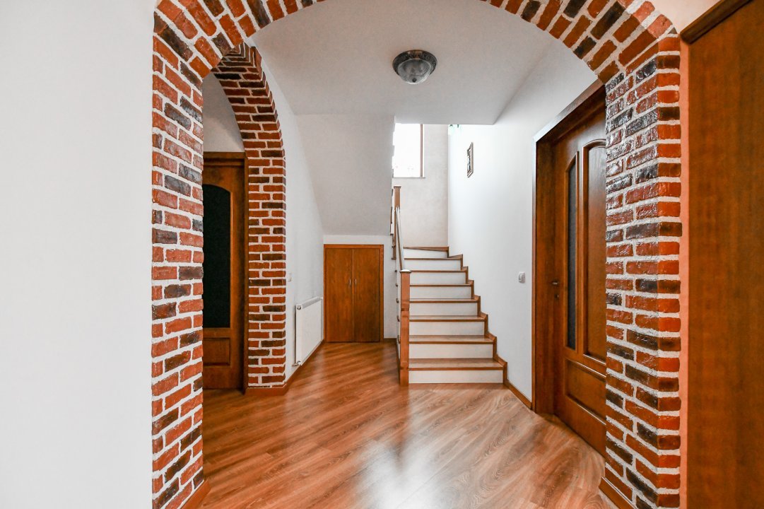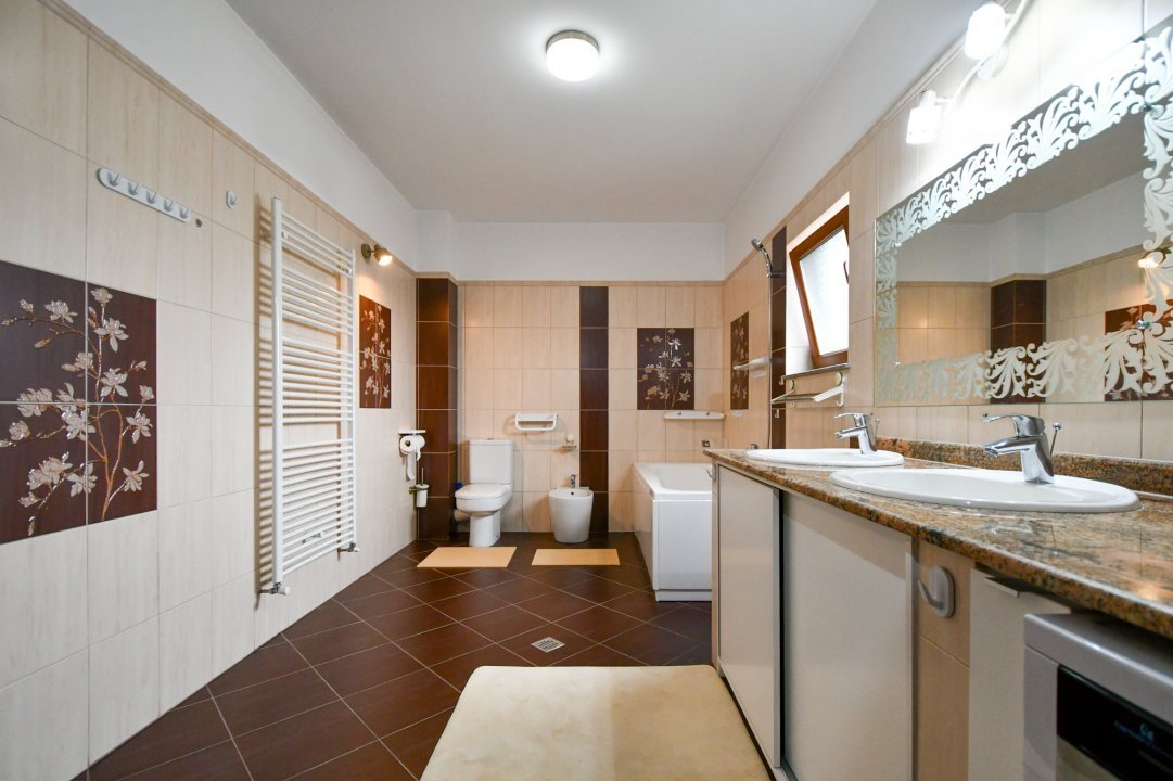 Ferestre din PVC (8 camere nuanta stejar) GEALAN si QFORT cu geam tripan reflexiv si geam sablat ornament, pervazuri din granit si feronerie MACO, gresie si faianta ceramica portelanata, parchet laminat trafic intens 12mm, instalatii alimentare apa din PPR (verde) cu bariera termica, instalatie scurgere/canalizare ingropata cu evacuare mare de ø160, instalatii termice din PPR verde cu bariera termica si UPONOR prin manson de protectie asistate de distribuitoare de caldura montate pe fiecare nivel, centrala termica pe gaz RIELLO FAMILY ITALIA 36KW in condensare cu boiler 110L incorporat si stabilizator de tensiune, calorifere otel si portprosop in bai, sistem fotovoltaic compus din 12 panouri Sharp cu putere 6,8 KW montate pe ferme metalice (costuri minime in timp - prosumator de 3 ani), invector Huawei putere 12KW, bransament 380V cu putere instalata 15KW, instalatii electrice 220V din cupru multifilar (bransament general Ø6, coloane alimentare Ø4, prize Ø2,5 si iluminat Ø2,5) asistate de tablou sigurante automate elaborat pe fiecare nivel, cu prize si intrerupatoare modulare Schneider si doze generale de legatura in fiecare camera, instalatie curenti slabi (internet si cablu TV) in camere, aparat de aer conditionat Mitsubishi Inverter 22000 BTU, sistem de alarma PARADOX, conectat la firma de paza si monitorizare video 24h/24h cu 8 camere de luat vederi receiver si monitor, videointerfon, usi interior din lemn stratificat cu garnituri etansare si feronerie premium, scara interioara din beton armat cu trepte placate lemn frasin si mana curenta lemn, usa acces imobil din PVC cu ranforsare antiefractie, baile dotate cu obiecte sanitare de la diverse firme de prestigiu IDEAL STANDARD - HANSGROHE etc, interior finisat cu stucco venetian si zugraveli lavabile.