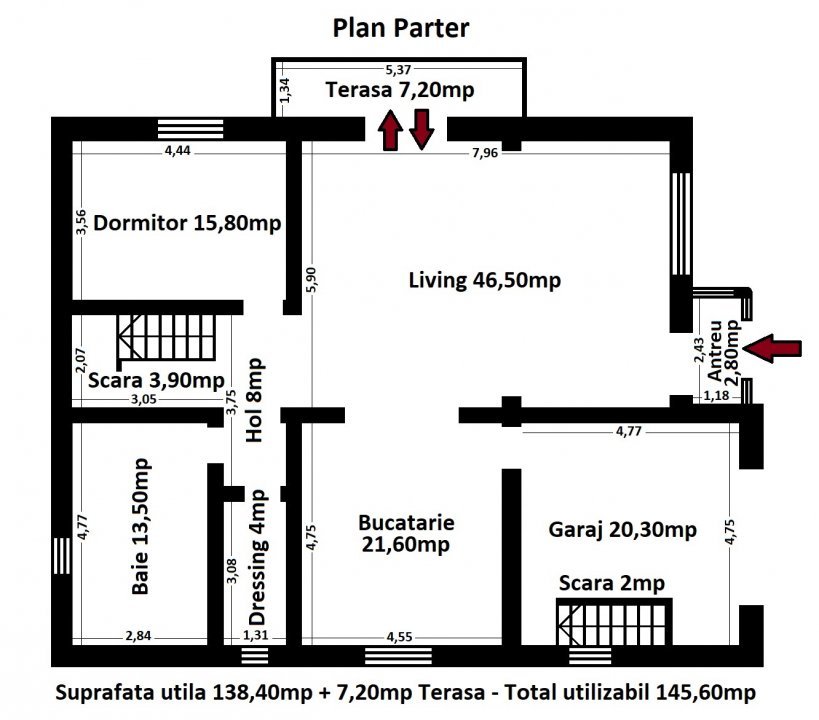 Parter – Antreu, living cu iesire pe terasa si in curte, dormitor, bucatarie, baie, dressing, garaj, hol si casa scarii – Total util 138,40 + 7,20mp terasa;
