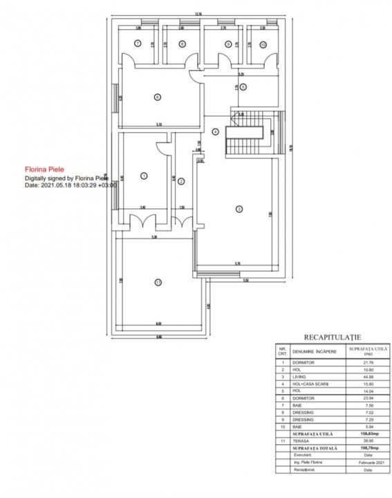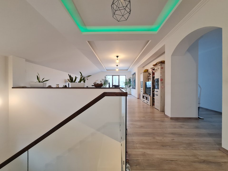 Etaj: Living suplimentar de 75 mp, 3 dormitoare matrimoniale fiecare cu baie și dressing propriu, plus 2 dormitoare pentru oaspeți.