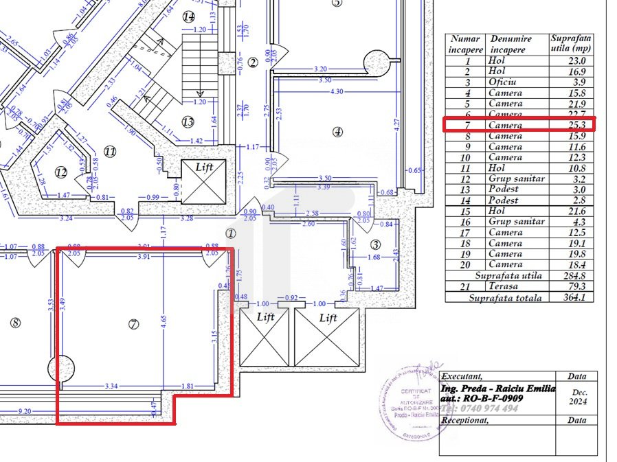 Spațiul de birouri se află la etajul 7, dispune de o cameră având suprafața utilă de 25.3 mp la care se adaugă spațiile comune. Spațiul are acces la un grup sanitar comun.