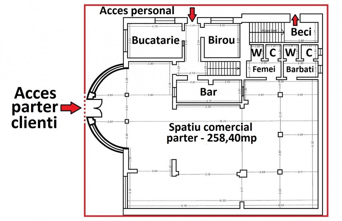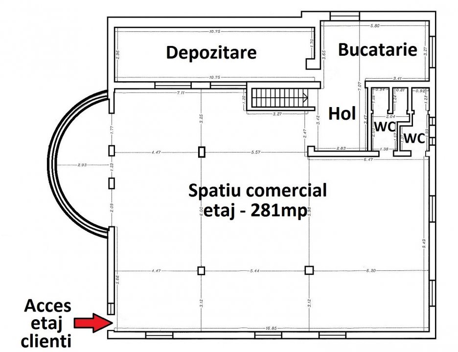 In cazul in care activitatea chiriasului necesita extinderea suprafetelor, proprietatea dispune de un beci de 26,23mp (pentru depozitare) si de etaj cu dublu acces in suprafata de 281mp (suprafata utila totala 565,63mp).