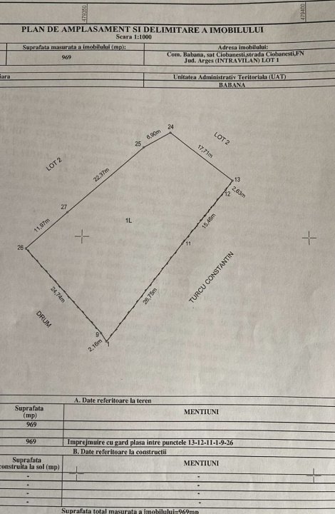Va prezentam spre achizitie acest teren minunat situat la aprox. 10 km de Pitesti, in comuna Babana, sat Slatioarele, perfect pentru construirea unei case. Terenul are suprafata de 969 mp cu deschidere de 24,74 m, utilitati: apa, curent electric, statie de autobuz, scoala in proximitate. Este o zona de deal superba, in continua dezvoltare iar acest teren este oportunitatea perfecta pentru casa ta de vis! Suna chiar acum pentru a programa o vizionare! Totul cu 0% COMISION pentru cumparator!