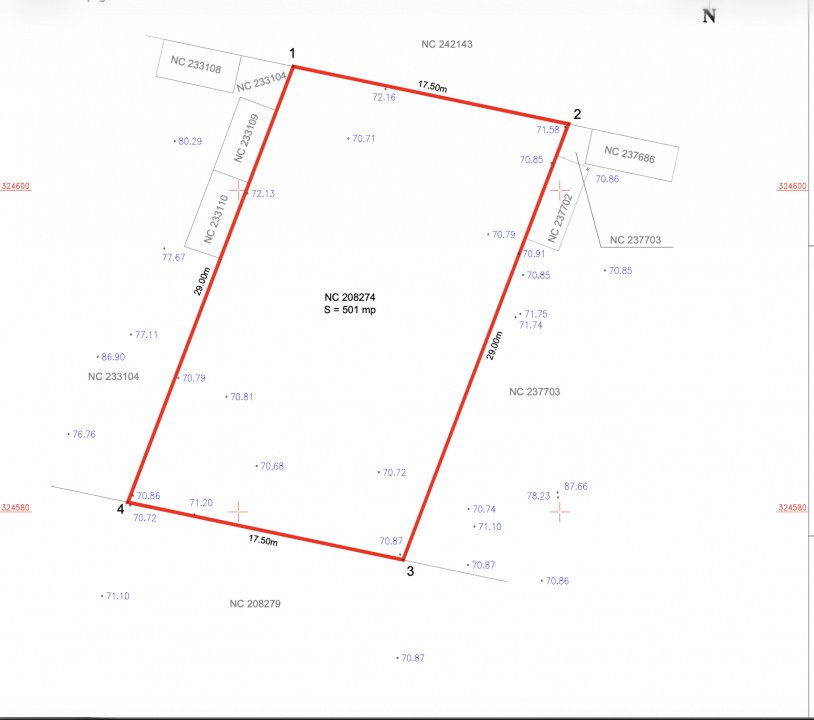 Proprietatea este compusă din 501,27 mp teren construibil și 79,05 mp cotă indiviză din drumul de acces, având o deschidere de aproximativ 17 metri liniari și acces din drum de 6 metri lățime, un avantaj real în comparație cu multe loturi din zonă.