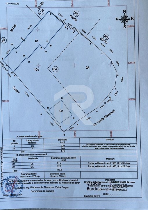 Proprietatea are un teren de 575 mp și o casă din cărămidă (amprentă 90 mp), care necesită renovare completa sau reconstrucție.
