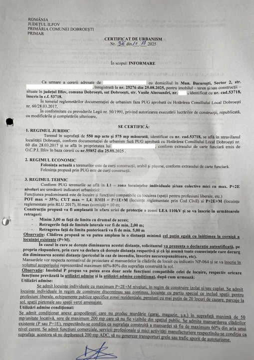 Proprietatea are un teren de 575 mp și o casă din cărămidă (amprentă 90 mp), care necesită renovare completa sau reconstrucție.